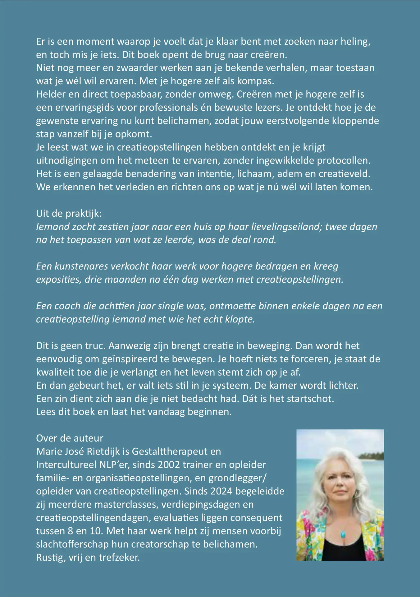 Dit boek begint op die plek. Het eindeloze waarom van gisteren laten we los en we openen de deur een klein beetje. We creëren een kiertje waar licht door valt. Creëren is moeiteloos en vol aandacht. Je hogere zelf is als een hand aan de andere kant van die deur. Stil aanwezig en onmiskenbaar als je leert luisteren. Het is veel minder groots dan je misschien denkt. Je verlangen creëert de beweging.